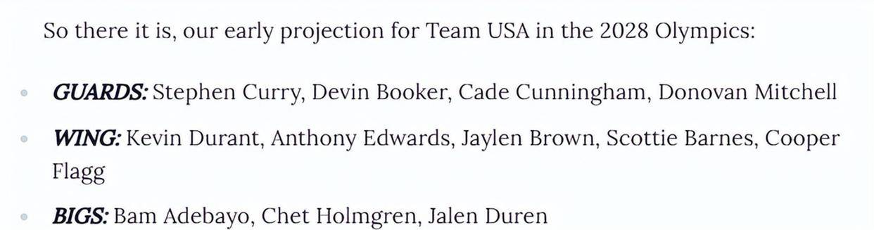 美媒ClutchPoints在杜兰特表态后,迅速对2028年美国男篮的12人名单展开了分析和预测。 他们假设杜兰特与库里将领衔出战,并给出了具体的阵容名单。